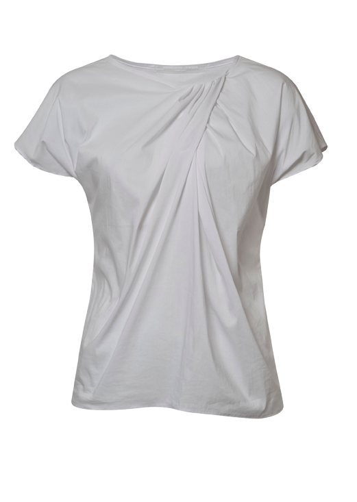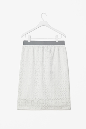 Mary portait en journée, une jupe blanche signée Cos, une blouse blanche signée Bogelund Jensen, ses escarpins Gianvito Rossi et une pochette Marc Jacobs